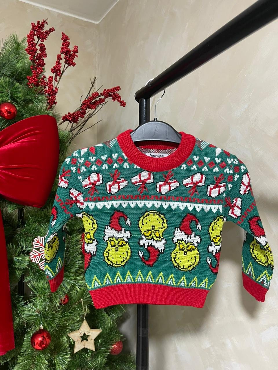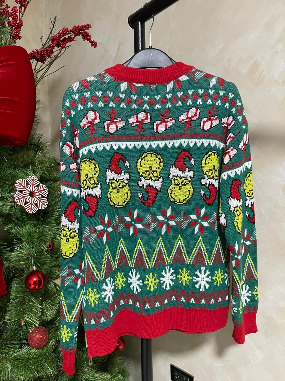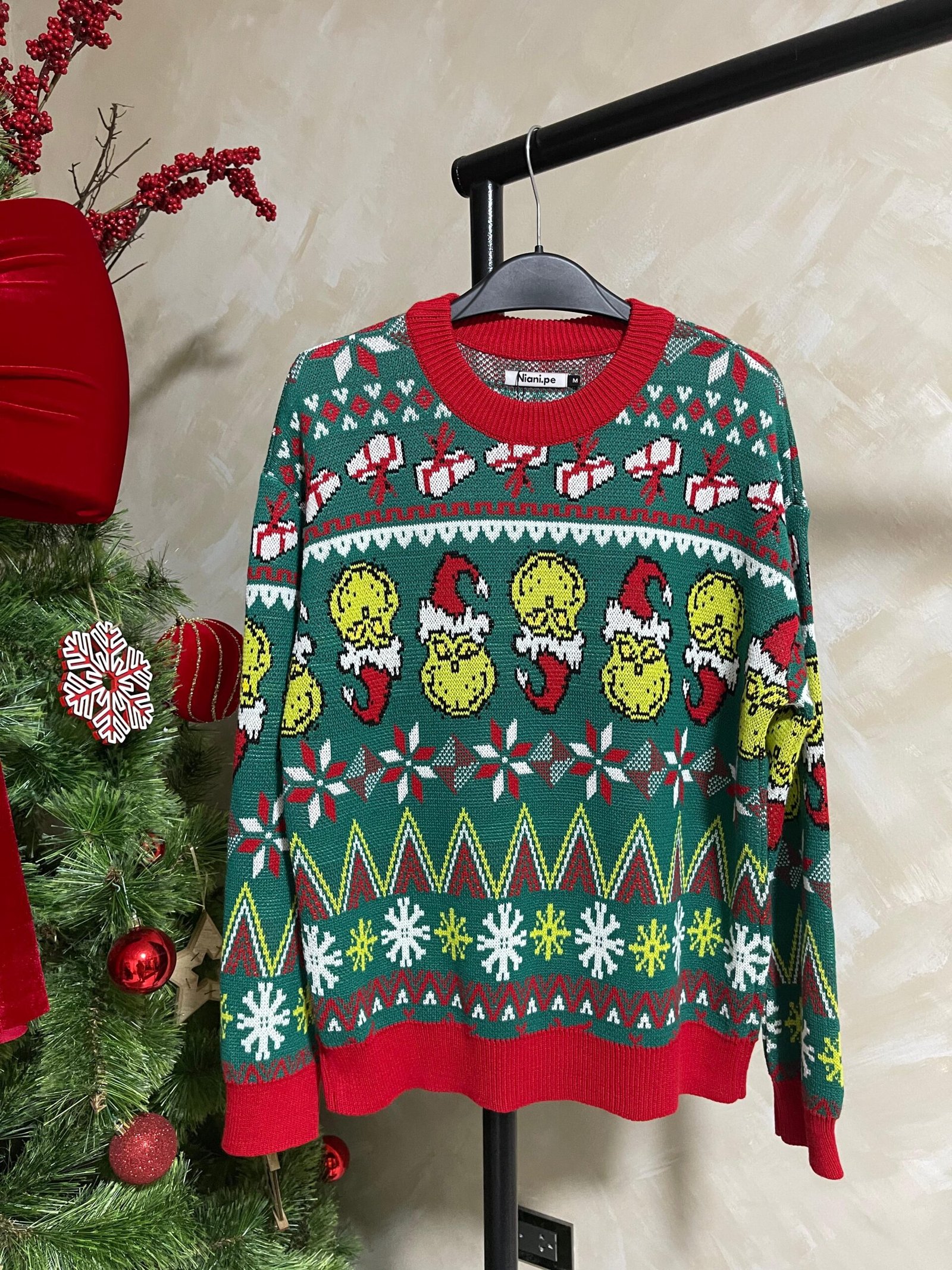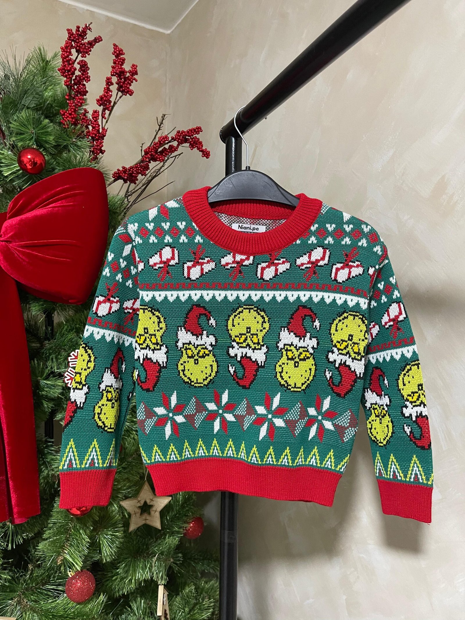 Sweater navideño modelo Grinch tejido jacquard en hilo de 3 ebras con acabado A1.