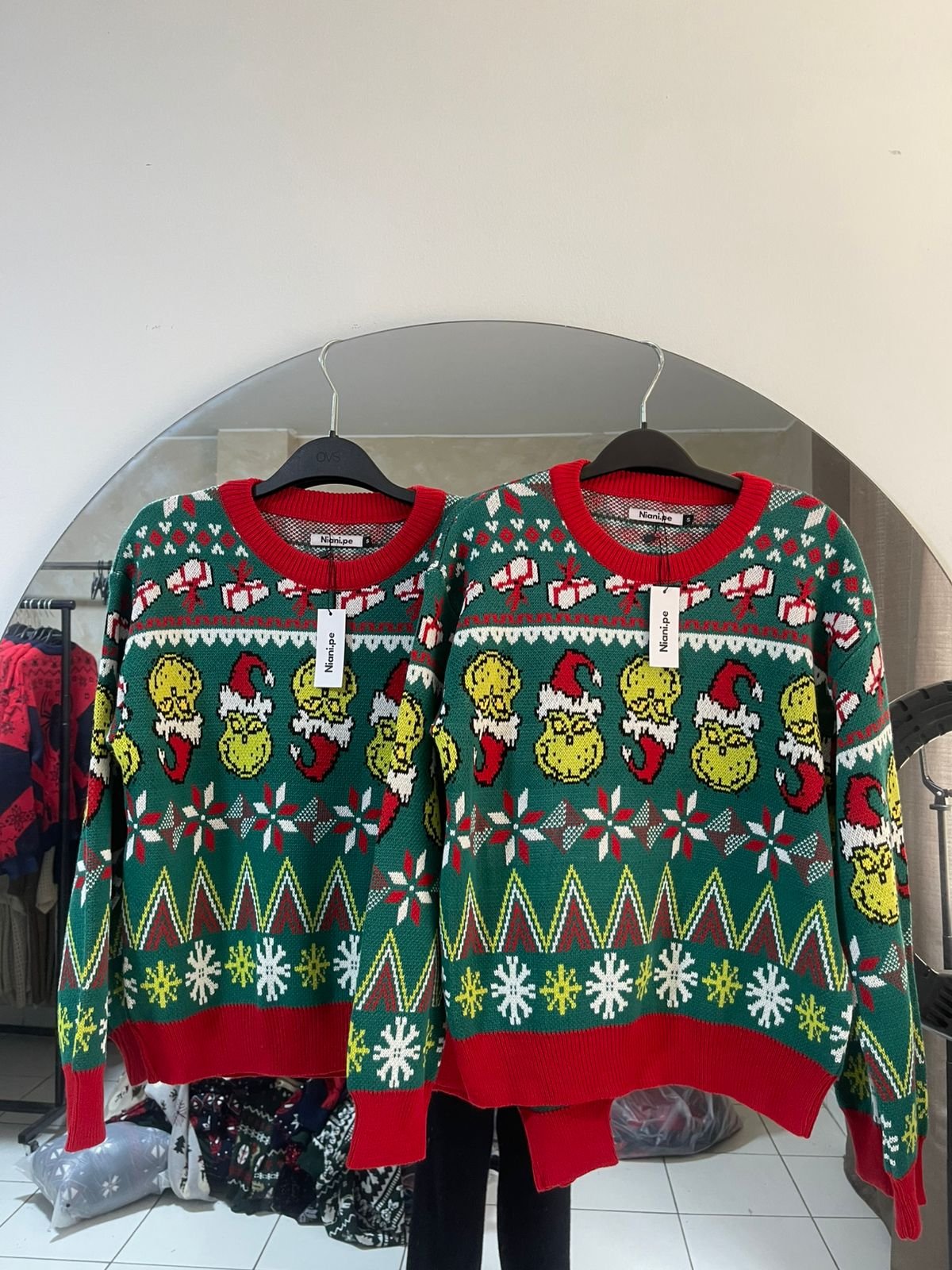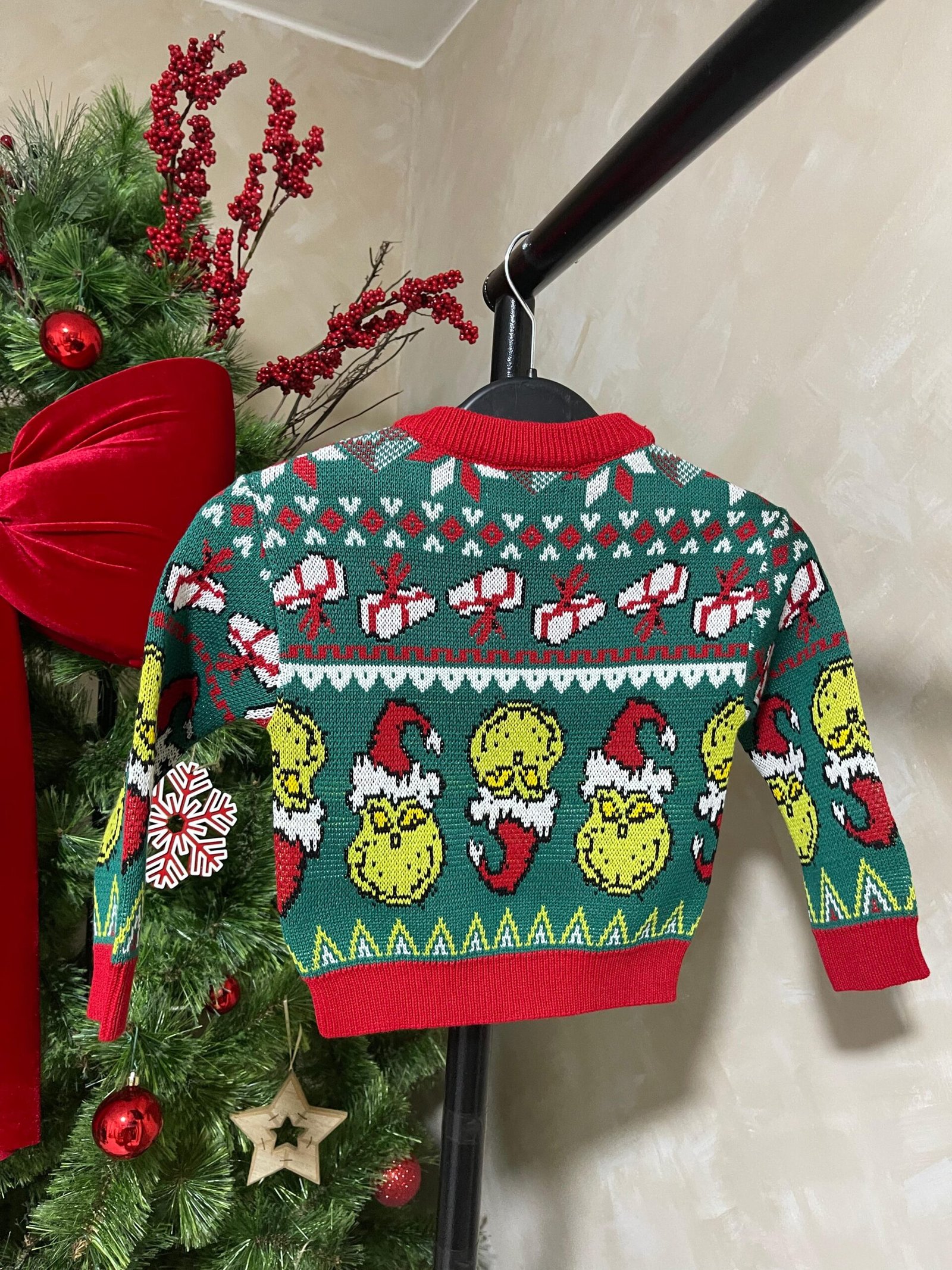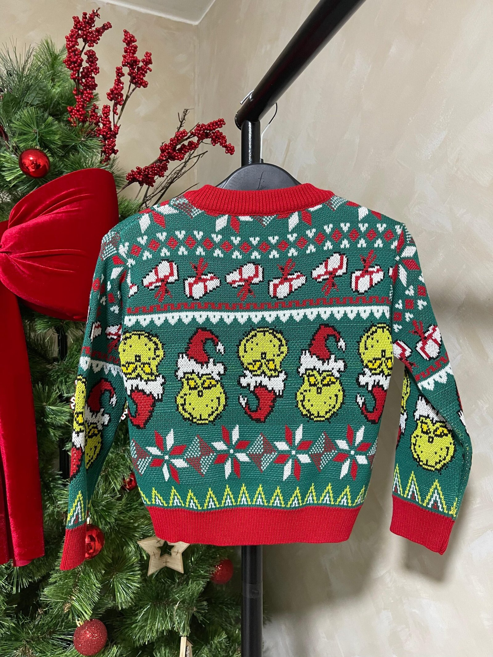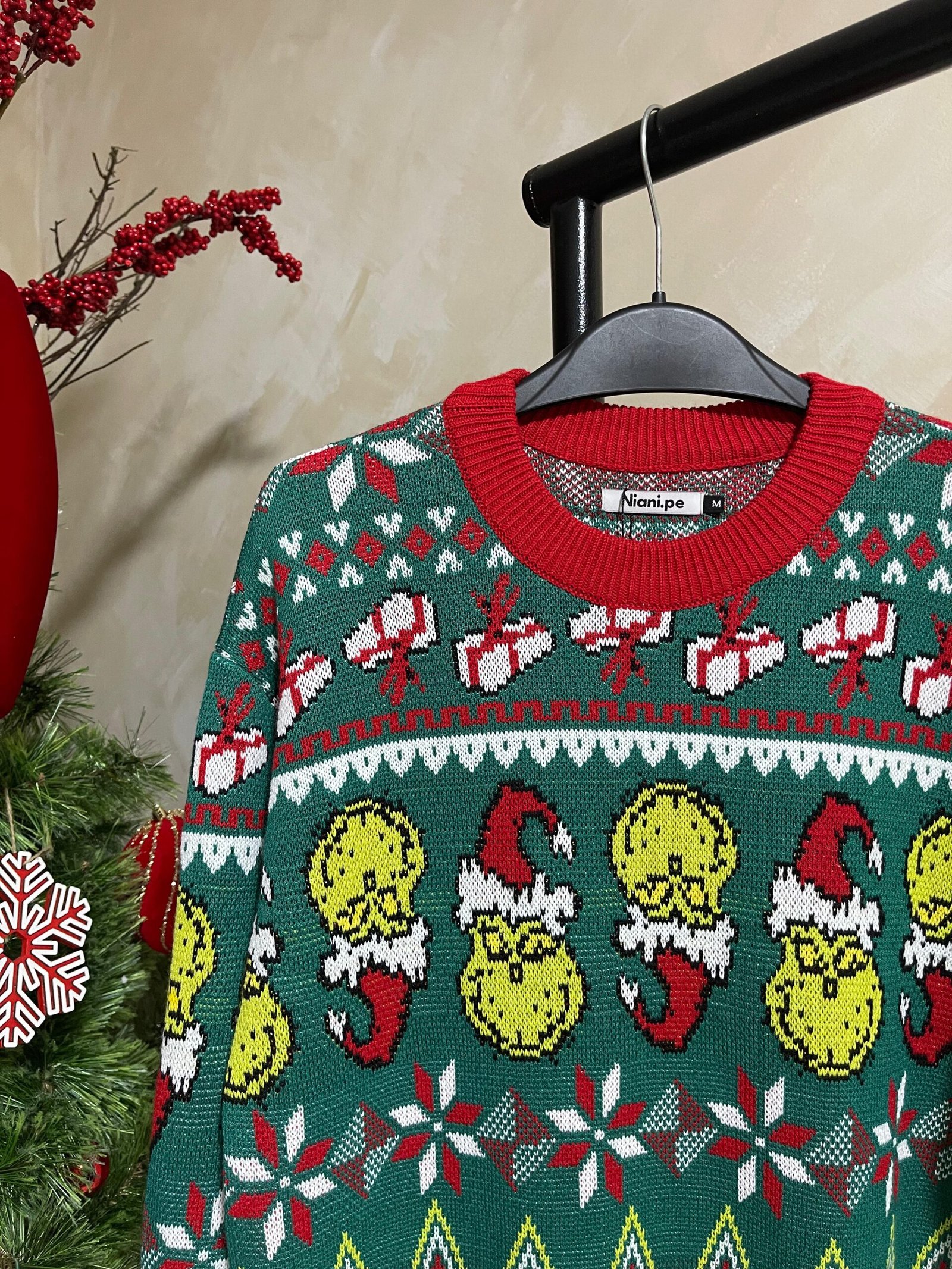 Sweater navideño modelo Grinch tejido jacquard en hilo de 3 ebras con acabado A1.