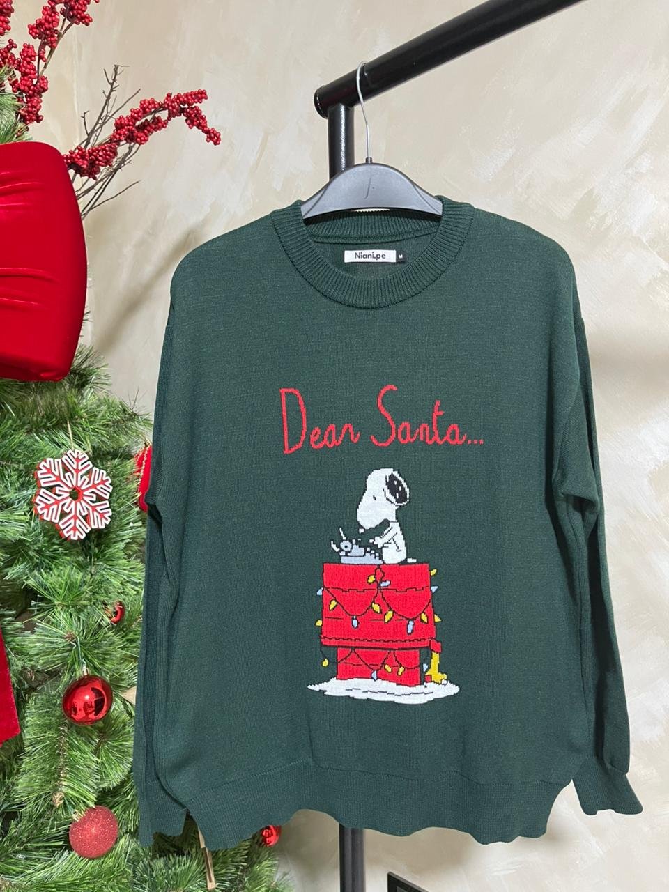 Sweater navideño modelo Snoopy tejido jacquard en hilo de 3 ebras con acabado A1.